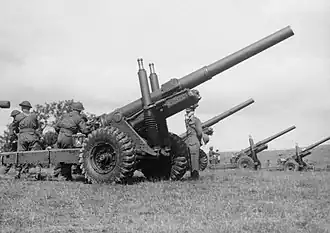 During the preparations for the Invasion of Normandy, 63rd Medium Rgt was assigned to 21st Army Group in May 1943, landing in France in June 1944 as part of 8th AGRA.[26][29][30][40][41] The regiment served throughout the North West Europe campaign in support of various operations. For example, 8 AGRA supported VIII Corps during Operation Jupiter (the recapture of Hill 112 on 10 July 1944),[42] 15th (Scottish) Division in Operation Guildford (the capture of Blerick on 2 December 1944),[43] and XII Corps during Operation Plunder (the crossing of the Rhine on 23 March 1945).[26][44]