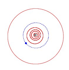 Orbit of Rubincam (blue), inner planets and Jupiter (outermost)