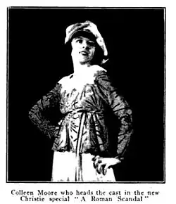 A magazine ad featuring Colleen Moore as a new actress for Christie Film Co. starring in the film A Roman Scandal.