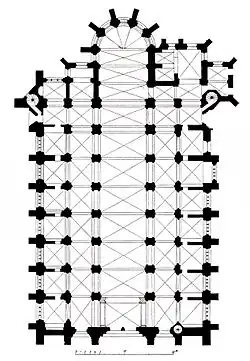 The ribbed vaults are quadripartite. The thrust of the vaults is taken up by buttresses. In the nave, they are supported by rectangular piers confined by half-columns taking up the fallout from the transverse arches and large arcades.