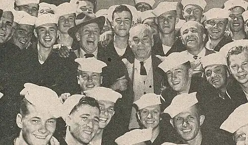 Hollandersky's long career with the Navy included work as an independent supply boat operator or "bum boater" from which he sold magazines and newspapers to the fleet. His boat was a small motorized dingy that was rumored to have been given to him by Admiral Robley Evans. Early in his career, Abe saved several people from drowning and rescued stranded boats in Gardiner Bay off the docks of New London while "bum boating" for the Navy. "Bum boating" consisted of taking a small launch out to naval vessels and selling newspapers, magazines, and small supplies to Navy personnel. In his small launch, he also performed tasks such as delivering mail to naval ships.[49] In his mid-career with the Navy, he worked as a boxing instructor for sailors at the pier in New London near the end of WWI, and as a recruiter of 1,700 naval personnel in WWII while he was living in Los Angeles. He also gave boxing exhibitions and training, and sold newspapers to Naval ships during his world cruises. After cruising to California in 1925, Abe helped the Navy provide relief for the aftermath of the Santa Barbara earthquake that struck on June 29, 1925. He raised War Bonds in WWII, occasionally capitalizing on his contacts with former boxers, and entertainers, such as Jimmy Durante, with whom he had worked in a movie. He later assisted the Navy in providing relief following the March 10, 1933 Los Angeles area earthquake that had an epicenter near Long Beach, California, where he had his news stand. He was caught in the earthquake on the day it struck, and narrowly escaped injury.[50] By 1947, the Navy bestowed on Abe the "Award of Merit" for his recruiting of both men and women for WWII.[51]