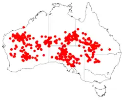 In it is found on rocky ridges, breakaways in skeletal sand soils in inland areas of all states of mainland Australia except Victoria.[3] In Western Australia it is found in the Mid West, Pilbara and Goldfields-Esperance regions where it grows in stony red sandy-clay-loam soils over ironstone, basalt or laterite.[2] In the Northern Territory it is found in the IBRA bioregions of Burt Plain, Central Ranges, Channel Country, Finke, Gibson Desert, Great Sandy Desert, Great Victoria Desert, Little Sandy Desert, MacDonnell Ranges, Mitchell Grass Downs, Mulga Lands, Pilbara, Simpson Strzelecki Dunefields, Stony Plains, and Tanami, and occurs on rocky or gravelly ranges, hills or rises composed of neutral or acidic rocks, sandplains, low sandy rises, dunefields, Mulga-dominated red earth plains, and creek floodouts.[4]
