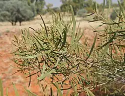 The spreading tree or shrub typically grows to a height of 5 metres (16 ft) with smooth fissured dark grey bark.[2] The plant generally has a rounded or obconic habit with several straight to crooked, spreading main stems from the base, forming a dense and spreading crown. The slightly shiny, glabrous, green to grey-green phyllodes are variable in shape and size They have a linear to narrowly oblong or narrowly elliptic shape and are 3.5 to 10 centimetres (1.4 to 3.9 in) in length with a width of about 1 to 5 millimetres (0.04 to 0.20 in). The phyllodes are coriaceous and have an erect or spreading arrangement. The plant flowers between May and July but sometimes as late as September with Inflorescences that have rudimentary racemes which are scattered over the plants and not particularly showy. The spikes are bright golden with small flowers, that eventually form flat seed pods which have a linear to narrowly oblong shape and are 4 to 9 cm (1.6 to 3.5 in) and a width of 3 to 5 mm (0.12 to 0.20 in).[3]