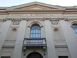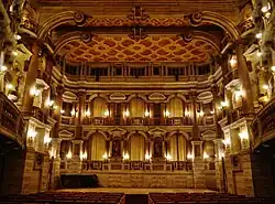 In the palace, designed by Giuseppe Piermarini and Paolo Pozzo in the neoclassical style, is the Teatro Scientifico (Scientific Theater) by Antonio Galli da Bibbiena, with a bell-shaped plan and four tiers of superimposed boxes, intended for the Academy's solemn events and inaugurated in 1769. Wolfgang Amadeus Mozart played here on 16 January 1770, when he was thirteen-year-old.[5][7]