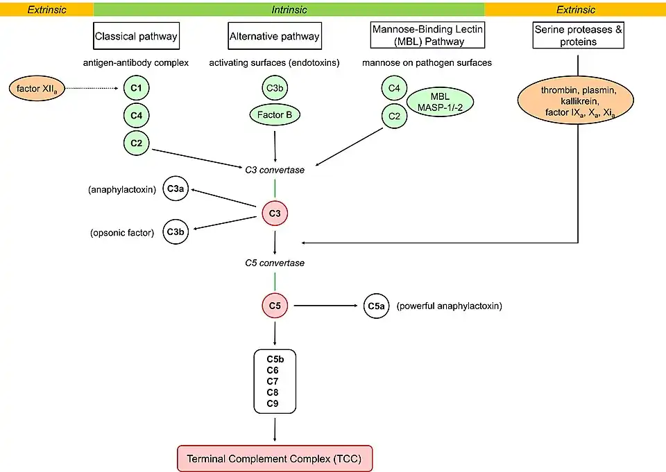 The C1 esterase inhibitor (C1-INH) enzyme plays a role in the classical pathway of the complement cascade, which is a component of the immune system response that acts to protect the human body from a variety of foreign substances.[5] As shown in the figure above, the complement cascade starts with the C1q protein which binds to an antibody-antigen complex that arises during an immune response to an invading substance.[5] When the complex is signaled for activation or turned on, then downstream proteins in the complement cascade are activated, including complement component 2 (C2), complement component 3 (C3), and complement component 4 (C4).[5] When these particular enzymes such as C3 and C4 are activated, their subsequent signals lead to an inflammatory response that involves localized edema, or swelling.[4] The role of C1-INH is to regulate and control the activities of the complement cascade, such that complement proteins remain in check and do not lead to unnecessary activity.[4] When there is a deficiency of C1-INH due to one of the previously mentioned causes, then the complement cascade remains continuously activated and can lead to potentially life-threatening swelling.[4]