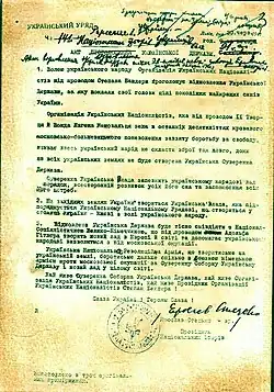 The act of restoration of the Ukrainian state (Ukrainian: Акт відновлення Української Держави) or proclamation of the Ukrainian state of June 30, 1941, was announced by the Organization of Ukrainian Nationalists (OUN) under the leadership of Stepan Bandera, who declared an independent Ukrainian state in Lviv. The self-proclaimed prime minister was Yaroslav Stetsko, and the head of the Council of Seniors was Kost Levytsky.