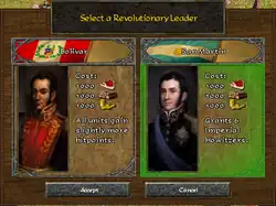 A sample revolution screen where the player (German civilization) decides whether to pick Simón Bolívar (Peru) or José de San Martín (Argentina), and their respective bonuses.