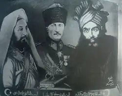 A postcard depicting Mustafa Kemal as a Muslim hero, with Ahmed Sharif as-Senussi (left) and Saladin (right)