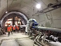 Construction of the tunnel began in September 2009.[4] By 2011, the tunnel boring machine, Élodie reached the Boulevard Périphérique, where the exit shaft was located.[5][6] The first phase of the extension was completed on 18 December 2012, with the opening of the station at Front Populaire.[7] With the tunnel completed, the second phase of the extension would involve the construction of two stations at a later date.[6]
