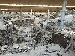 The Akrotiri excavation site is of a Cycladic cultural settlement on the island of Santorini, associated with the Minoan civilization due to inscriptions in Linear A, and close similarities in artifact and fresco styles.[4] The excavation is named for a modern village situated on a hill nearby. The name of the site in antiquity is unknown.
