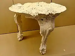 In regards to furniture, the volcanic ash which engulfed the city often penetrated into the houses in large quantities and, in these layers of fine volcanic dust, produced negatives of the disintegrated wooden objects. Using these negatives as molds, liquid plaster-of-Paris can be poured in and produce casts of parts, or even entire pieces of furniture such as beds, tables, chairs or stools. Offering tables are one of the most common finds in Akrotiri and were either made of clay or coated with plaster, decorated in the same technique as the wall paintings, and only consisted of three highly decorated legs and a top.[9]