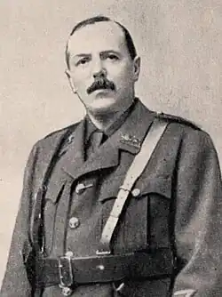 He arrived at Gallipoli on 13 May 1915 attached to the 1/7th Manchester Regiment, taking command of D Company from 17 June 1915, but was invalided out in late July 1915 due to dysentery and severe heat stroke (with the heat stroke being so severe that the ship returning him home was forced to leave him at Gibraltar), returning to service in 1917.[5] A photograph of him smoking at Fort Stamford in Plymouth was taken whilst he was serving with the 3rd Battalion of his regiment during this time.[8] He resigned from active military service in December 1917 due to his advancing age and the long term medical effects of his earlier illness.