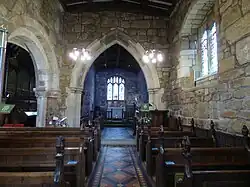 The church is built of gritstone with roofs of stone slate and tile, and consists of a nave, a taller north aisle and chapel, a south porch, a lower chancel and a west tower. The tower has three stages, a two-light west window, paired lancet bell openings, a corbel table with a gargoyle on the west, a coped parapet, and a squat pyramidal slate roof with a weathercock. In the porch are worked stones, including one from the Saxon period, and the inner doorway has a round arch. Inside, the chapel has a squint to the chancel. The font is 11th century, reworked in the 14th century, with an 18th-century cover, and some of the bench ends date from the 15th century.[1][2]