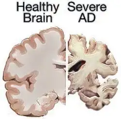 A healthy brain (left) and the brain of a late-stage Alzheimer's brain (right)