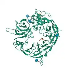 Clusterin (CLU), also known as apolipoprotein J, is an 82 kDa glycoprotein protein that is located on chromosome 8.[7][36][17] It has multiple physiological functions, some examples being lipid transport, immune modulation, and cell death.[17][36] CLU is known to have the ability to clear Aβ peptides and prevent their aggregation, which suggests that CLU has a neuroprotective effect.[17][36][7] While one might expect AD to be associated with lower levels of a neuroprotective protein, biomarker studies indicate that CLU is upregulated in the plasma, CSF, hippocampus, and cortex of AD patients.[17][36][7] One theory explaining this apparent contradiction is CLU is actually reduced early in life, increasing risk of developing AD.[17] In this scenario, CLU might increase in subjects with AD as a compensatory response to the disease; further research is clearly necessary to clairy this area.[17] However, genetic studies show that CLU is the third most significant risk factor for LOAD, which has propelled extensive genetic research related to CLU and AD.[36] Two CLU variants of interest, that are associated with reduced AD frequency, are rs11136000 and rs9331896.[17] However, little is known about the relationship between CLU and AD risk in the Hispanic/Latino community.[37]