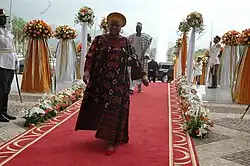 In 2014, Muna was criticised for transferring cultural artifacts from the Northwest Region to Yaounde.[5] On May 22, 2015, Prime Minister Philemon Yang gave Muna forty-eight hours to dissolve a new authors' rights structure (SOCACIM) she had created.[3][6] She was removed from her ministerial position in a government reshuffle by President Paul Biya on 2 October 2015, amid reports that she had mismanaged billions of francs in authors royalties.[7] In February 2016, staff sought to remove from her state-owned ministerial villa at Bastos, but she refused and claimed she had made arrangements to buy it. As of September 2016, she had not moved.[8][9][10]