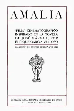 Amalia is a 1914 Argentine silent historical drama film directed and written by playwright Enrique García Velloso, produced by Max Glücksmann and photographed by Eugenio Py, based on the 1851−1855 novel of the same name by José Mármol.[2][1] The film was an initiative of the charity society Asociación del Divino Rostro, and the characters were played by a long list of members of Buenos Aires' elite.[2] The film's premiere on 12 December 1914 was an unprecedented event for national filmmaking, as it took place at the Teatro Colón, the most prestigious venue for the high society and aristocracy of Buenos Aires, with the presence of President Victorino de la Plaza and his ministers.[2][3]