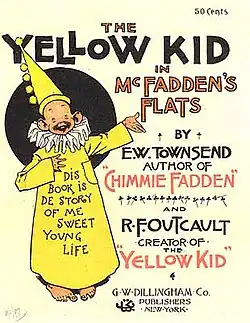 The G. W. Dillingham Company published the first known proto-comic-book magazine in the US, The Yellow Kid in McFadden's Flats, in 1897. A hardcover book, it reprinted material—primarily the October 18, 1896, to January 10, 1897, sequence titled "McFadden's Row of Flats"—from cartoonist Richard F. Outcault's newspaper comic strip Hogan's Alley, starring the Yellow Kid. The 196-page, square-bound, black-and-white publication, which also includes introductory text by E. W. Townsend, measured 5 by 7 inches (130 mm × 180 mm) and sold for 50 cents. The neologism "comic book" appears on the back cover.[12] Despite the publication of a series of related Hearst comics soon afterward,[12] the first monthly proto-comic book, Embee Distributing Company's Comic Monthly, did not appear until 1922. Produced in an 8+1⁄2-by-9-inch (220 mm × 230 mm) format, it reprinted black-and-white newspaper comic strips and lasted a year.[12][13]