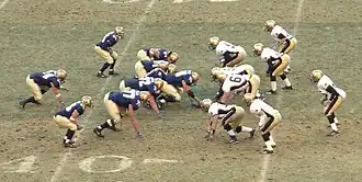 ![]() The Navy Midshipmen (left in blue) line up on offense against the Army Black Knights in the annual Army–Navy Game at Giants Stadium in December 2002 | |
