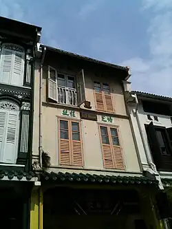 No. 22 Amoy Street shophouse, situated in the north-eastern edge of Chinatown that fringes the Central Business district of Singapore, is a Late Shophouse style. It has elements of western classical architecture and influences of the neoclassical jalousie windows of Europe, which can be seen on its facade: rhythm of three vertical bays with distinguished horizontal bands in the form of centrally paired door height window shutters; the Georgian-style fanlights, the Classical Roman Doric moldings, the use of Classical proportions and orders, Doric piers and Corinthian pilasters. On top of that, there is a mixture of Chinese and Western decoratives too. The shophouse also has elements of vernacular architecture with the jack roof, veranda, and louvred windows.