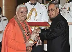 The President, Shri Pranab Mukherjee presenting the Padma Shri Award to Jagat Guru Amrta Suryananda Maha Raja, at a Civil Investiture Ceremony, at Rashtrapati Bhavan, in New Delhi on April 08, 2015