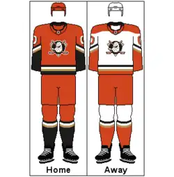 In 2015, an orange third jersey was unveiled, with the modified Mighty Ducks crest in front. The "webbed D" was moved to the shoulders. This set was used until 2017, and was brought back in a modern Adidas template starting in 2019.[204]