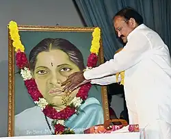 The Vice President, Shri M. Venkaiah Naidu paying homage to Dr. Durgabai Deshmukh at the Founder's Day Celebrations of Andhra Education Society, in New Delhi on 15 July 2018
