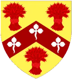 Or on a chevron between three garbs Gules as many trefoils slipped Argent.
