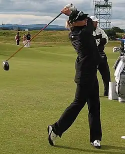 At this point in her career, Sörenstam says she lost focus having reached her biggest goals.[6] Karrie Webb became the best LPGA Tour player but Sörenstam still managed to win more LPGA tournaments than any other LPGA Tour player during the 1990s.[32] She qualified for the World Golf Hall of Fame when she won the 2000 Welch's/Circle K Championship, but was not eligible for induction until finishing her tenth year on the LPGA tour in October 2003.[40][41] Sörenstam was the first international player to be inducted into the Hall of Fame through the LPGA criteria.[42][43][44]