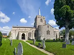 The Church of England parish church of Saint George is a cruciform building of flint with stone dressings. Its earliest parts are the chancel, transepts and crossing tower, all of which were built in the 12th century. The church was altered in the 13th century and the nave was rebuilt in the 14th century. The south porch and the top stage of the tower are 15th century. The church was restored in 1871–72 under the direction of the Gothic Revival architect William Butterfield. Repairs in 1907 were directed by the architect Arthur Blomfield. St George's is a Grade I listed building.[3] The lychgate is a separate Grade II listed building, as it incorporates a lockup which was apparently used until the beginning of the 20th century.[4]