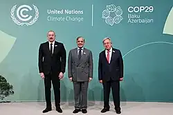 In June 2019, Guterres stated that the "U.N. has the obligation to assume global leadership" in tackling climate change in the context of a visit to the pacific island of Tuvalu.[80] He had previously supported other multilateral environmental initiatives, such as ecocide becoming a crime at the International Criminal Court and the Global Pact for the Environment that was put forward by France in September 2017.[81][82][83] In September 2019, Guterres condemned Israeli plans to annex the eastern portion of the occupied West Bank known as the Jordan Valley.[84] Guterres expressed his "deep concern" at the spiralling violence in Syria a day after Turkey launched an offensive in Kurdish-controlled areas. He said any solution to the conflict needed to respect the sovereignty of the territory and the unity of Syria.[85][86]