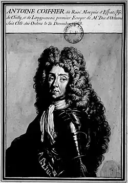 Antoine II Coëffier de Ruzé, Marquis d'Effiat, born 1638[1] or 1639,[2] was the son of Martin Coëffier de Ruzé, Marquis d'Effiat (1612-1644) and Isabeau d'Escoubleau de Sourdis (died 1644), married in 1637. He was the nephew of the Marquis de Cinq-Mars, a favorite of Louis XIII who was executed in 1642 for conspiring against Richelieu, and the grandson of his namesake Antoine Coëffier de Ruzé, Superintendent of Finances and Marshal of France.[2]