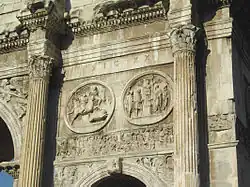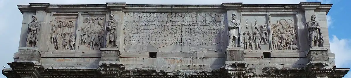 The horizontal frieze below the round reliefs are the main parts from the time of Constantine,[5] running around the monument, one strip above each lateral archway and including the west and east sides of the arch. These "historical" reliefs depict scenes from the Italian campaign of Constantine against Maxentius which was the reason for the construction of the monument. The frieze starts at the western side with the Departure from Milan (Profectio). It continues on the southern, face, with the Siege of Verona (Obsidio) on the left (South west), an event which was of great importance to the war in Northern Italy. On the right (South east) is depicted the Battle of the Milvian Bridge (Proelium) with Constantine's army victorious and the enemy drowning in the river Tiber.[5] On the eastern side, Constantine and his army enter Rome (Ingressus); the artist seems to have avoided using imagery of the triumph, as Constantine probably did not want to be shown triumphant over the Eternal City. On the northern face, looking towards the city, are two strips with the emperor's actions after taking possession of Rome. On the left (North east) is Constantine speaking to the citizens on the Forum Romanum (Oratio), while to the right (North west) is the final panel with Constantine distributing money to the people (Liberalitas).[29][30]