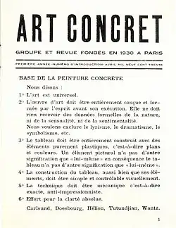 Base de la peinture concrète, was written by Otto G. Carlsund, Theo van Doesburg, Jean Hélion, Marcel Wantz and Léon Arthur Tutundjian, published in Revue Art Concret, no. 1 (April 1930).