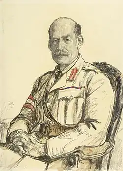 He also served in the First World War, which began in the summer of 1914, becoming brigadier general, Royal Artillery of the 8th Division,[14] in which capacity he took part in the Battle of Neuve Chapelle in March 1915.[3] In June he was made a CB.[15] In July he became BGRA for VII Corps but was only there briefly as in September, after being promoted to the temporary rank of major general,[16] he succeeded Major General Richard Haking as general officer commanding of the 1st Division.[3] His major general's rank having been made substantive in January 1916,[17] he led his division in 1916, although not in any major actions, and continued his war service as major general, Royal Artillery for General Sir Edmund Allenby's Third Army from June 1916.[18] He became GOC of I Corps from February 1917, upon being made a temporary lieutenant general, and which he commanded for the remainder of the war.[19]
