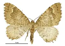 The expansion of the wings is about 1+1⁄8 inches. The fore-wings are rather dark greyish-brown; there are numerous indistinct wavy paler and darker transverse lines near the base; a rather broad transverse brown band towards the middle, shaded towards the base, and edged with an interrupted jagged white line towards the termen; beyond this there are several broken darker and paler lines. The hind-wings are very pale greyish-ochreous, clouded with grey near the base, and with several rows of small cloudy grey spots near the termen. The female is paler than the male and the markings are less distinct.[5]