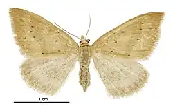 Male, female. — 28-30 mm. Head, palpi, antennae, and thorax very pale brownish-ochreous. Abdomen ochreous-grey-whitish. Legs whitish-ocbreous, anterior femora and tibiae dark fuscous above. Forewings with costa gently arched, posteriorly more strongly, hindmargin slightly bowed, rather oblique; very pale glossy brownish-ochreous; four series of minute black dots on veins; first near base; second at 13, curved; third from 34 of costa to 23 of inner margin, rather prominent in middle, preceded by a cloudy fascia slightly darker than ground-colour; fourth subterminal; a minute black discal dot; hindmarginal space sometimes slightly darker : cilia whitish-ochreous, tips paler. Hindwings ochreous-grey-whitish; a cloudy indistinct pale fuscous hindmarginal fascia, containing a dentate subterminal line of ground-colour; cilia pale whitish-ochreous.[3]