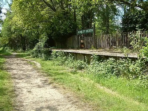 Ashley Heath Halt was a railway station in England on the Southampton and Dorchester Railway formerly in the county of Hampshire (now part of Dorset). Opened in 1927, it served the areas of St Leonards and St Ives as well as the village of Ashley Heath itself. This was an emerging residential area, the northern part of what is now the South East Dorset conurbation. The halt consisted of two concrete platforms each with a shelter. There was also a public siding for goods traffic behind the down (south) side platform. The halt was closed during the Beeching Axe, losing its passenger trains in 1964.