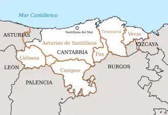 Asturias de Santillana is a historical comarca whose territory in large part corresponded to the central and western part of today's autonomous community of Cantabria, as well as the extreme east of Asturias. Most of the province of Asturias belonged to the comarca of Asturias de Oviedo. Also known also as a merindad and documented since the 13th century, Asturias de Santillana comprised the western part of Cantabria (except Liébana which belongs to another comarca) including the Saja River valley and the Nansa River. Its borders used to go along the coast from the council of Ribadedeva to the municipality of El Astillero (old Camargo Valley), to the shores of the Bay of Santander), which leads to the administrative division of Trasmiera. From the south it went up to the Cantabrian cordillera. All of the valleys of this comarca are perpendicular to the coast.