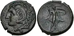 There is another group of provincial Roman coins that depict the bust of Athena alone. In this depiction she is wearing a Corinthian helmet with a "wave" of hair upon her forehead.[3] These coins date from the first half of the second century CE to the second half of the third century CE and are considered to be the most common. Since more coinage depictions of Athena wearing a Corinthian helmet have been found as opposed to those that depict her with an Attic helmet, it is thought that the Corinthian were a more popular representation.[3]