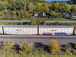 A major problem left to solve was that the new autorack cars did not provide any protection from theft, vandalism, or severe weather. Individual railroads began installing mesh side screens and solid panels to their racks to protect the vehicles from impact and debris in the late 1960s,[10] and by the early 1970s new racks were being delivered with these side panels. However, thieves and vagrants could still gain access to the automobiles. In 1973 the first fully enclosed racks with continuous side panels, end doors, and roofs were developed to address this problem. Whitehead & Kales, Ford, N&W and DT&I jointly developed a Snap-Pak prototype enclosed tri-level car, NW 400000.[11] The car side was made up of overlapping perforated steel sheets. The ends were protected with two trifold doors, and a corrugated steel roof extended the full length of the car.[12] A competing RailPac prototype was developed by Portec-Paragon, Chrysler, and several railroads. It featured mesh screen side panels, vertically sliding three-piece doors, and a similar roof.[12] The Southern Railway and Greenville Steel Car developed a unique 124-foot (38 m) articulated three-unit Autoguard car with single-axle trucks, SOU 599000-599001.[13][14]