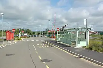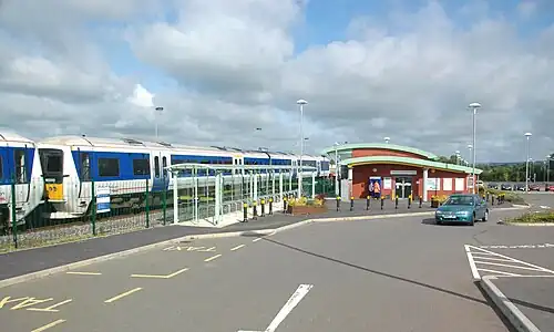 Aylesbury Vale Parkway station, showing the taxi rank (left), cycle shelter (centre) and booking hall (right) | |||||