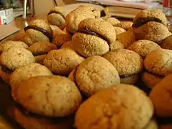 Baci di dama (Italian: [ˈbaːtʃi di ˈdaːma]; Piedmontese: basin ëd dama; lit. 'lady's kisses')[1] are a type of northern Italian sandwich biscuit consisting of two hazelnut biscuits joined together by a chocolate filling, representing the "kiss" in the name. Considered a standard of Italian confectionery, these are a common item at bakeries throughout Italy and in Italian diaspora communities. Though traditionally made with hazelnut cookies, there are currently many modern flavour variations. The most common variations are made with almonds, pistachios, and cocoa in place of hazelnuts.