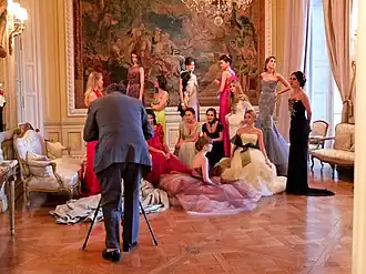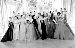 The young women wear haute couture dresses by European designers[36] and overseas fashion houses. They all wear jewelry from the same jeweler.[37] Some couture houses have produced special ball gowns for the event. In 2003, Carolina Herrera made one for Diana Mellon, and in 2014 Danish designer Jesper Hovring made a dress for Viola Mikkelsen.[38] In 2018, the Indo-French fashion house Lecoanet Hemant made a gown for Princess Ananya Raje Scindia of Gwalior.[39] Jet Li's daughter Jane Li was dressed by Dior in 2019.[40]