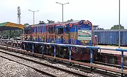 In 2012, Bangladesh Railway ordered broad-gauge diesel-electric locomotives from India, modeled as WDM-3A. These 26 locomotives were imported to Bangladesh in 2012, 2013 and 2014.[2] These locomotives have a power of 3100 hp. They are fitted with AAR coupling and have a gear ratio of 65:18.[3] These locomotives are marked as BED-30, which stands for broad gauge diesel-electric manufactured by DLW, engine with 30 * 100 hp (30), and numbered as 6501 - 6526.