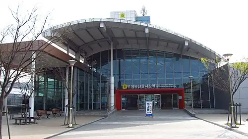 Banyeo Agricultural Market Station (Korean반여농산물시장역; Hanja盤如農産物市場驛) is a station of the Busan Metro Line 4 in Seokdae-dong, Haeundae District, Busan, South Korea. The station name comes from the nearby Banyeo Agricultural Products Wholesale Market.