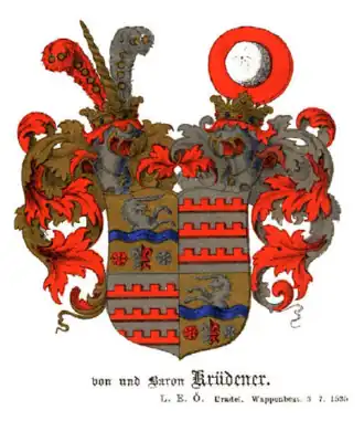 Beate Barbara Juliane Freifrau[1] von Krüdener (née Freiin[2] von Vietinghoff genannt Scheel; 22 November [O.S. 11] 1764 – 25 December [O.S. 13] 1824), often called by her formal French name, Madame de Krüdener, was a Baltic German religious mystic, author, and Pietist Lutheran theologian who exerted influence on wider European Protestantism, including the Swiss Reformed Church and the Moravian Church, and whose ideas influenced Tsar Alexander I of Russia.