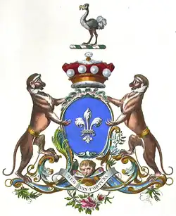 Arms of Digby: Azure, a fleur-de-lis argent. Crest: An ostrich, holding in the beak a horse-shoe all proper. Supporters: On either side a monkey proper environed about the middle and lined or. | |