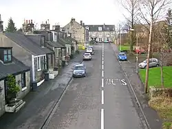 Barrmill from near the old mill offices. The wall to the left is the frontage of old mill workers' cottages.
