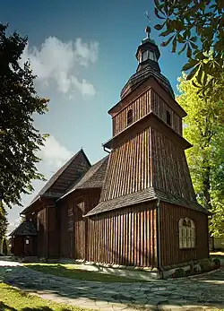 The wooden parish church of St. Erasmus was built in the second half of the 18th century. It was financed by the district landlord, Jan Biberstein-Starowieyski. The spire is a remnant of the previous 16th-century church of the Assumption of the Blessed Virgin Mary. The layout, in which the spire is located to the east of the chancel, is unusual and rarely found. There is polychrome decoration dating from the end of the 18th century, which features figurative, vegetative and geometric motifs. On the chancel ceiling you can see a painting of The Assumption of the Blessed Virgin Mary, while in the nave there is The Transfiguration of Our Lord on Mount Tabor. The main altar contains an 18th-century painting of St. Erasmus.
